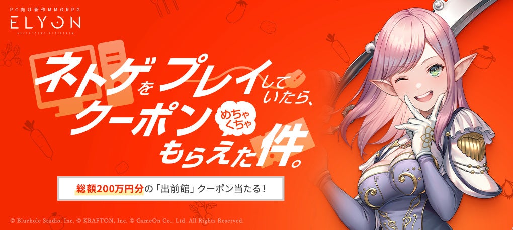 株式会社ゲームオン[本社:東京都渋谷区、代表取締役社長:文 智秀(ムン・ジス)]が運営する新作MMORPG『ELYON』(以下『エリオン』)において、総額200万円分の「出前館」クーポンが当たるキャンペーン「ネトゲをプレイしていたら、クーポンめちゃくちゃもらえた件。」の最終週の応募受付を本日より開始いたします。