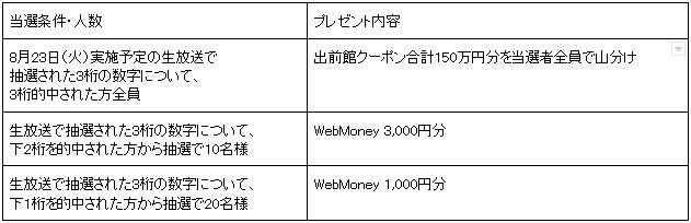 レベル20以上のキャラクターで『エリオン』にログインし、公式生放送で抽選される3桁の数字を予想いただくことでご参加いただけるキャンペーンとなっております。見事抽選された3桁の数字を的中させた方全員で、毎週決められた金額の「出前館」クーポンを山分けいたします。