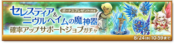 期間中、「セレスティア&ニヴルヘイムの魔神器確率アップ サポートジョブガチャ」を販売します。