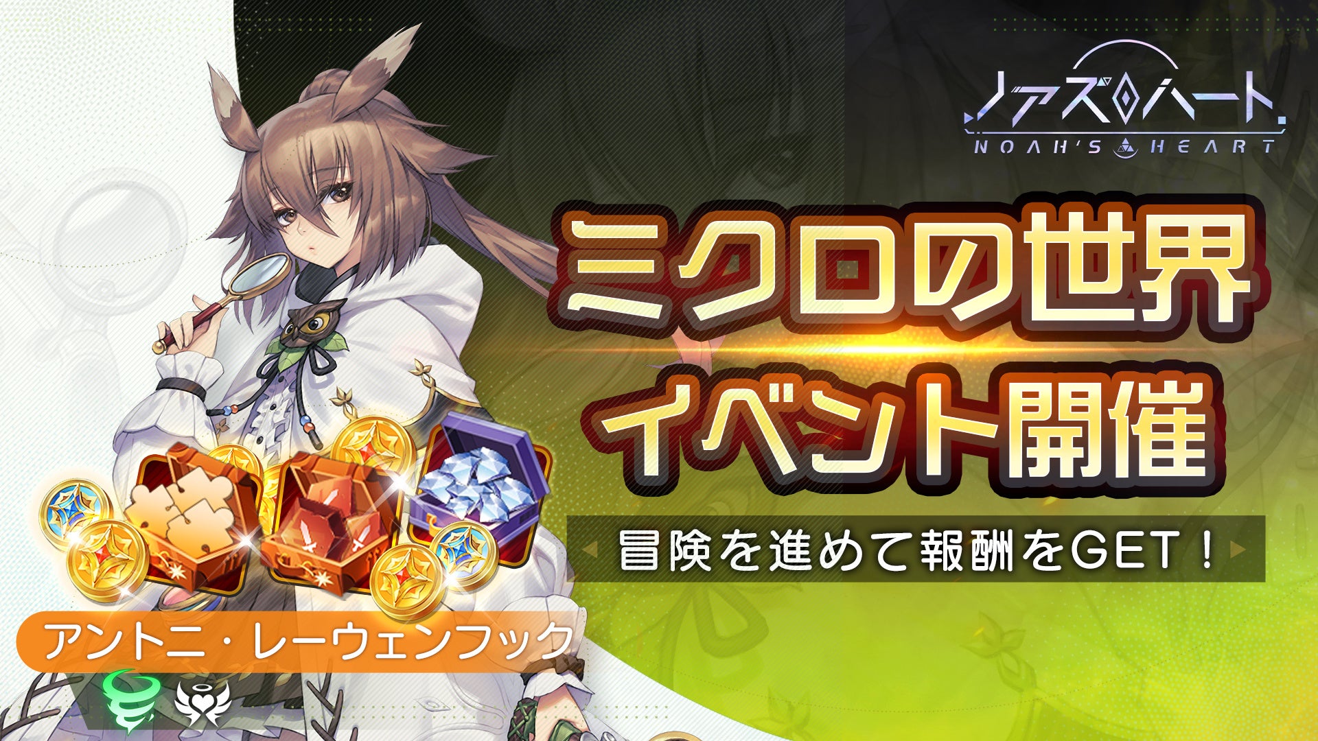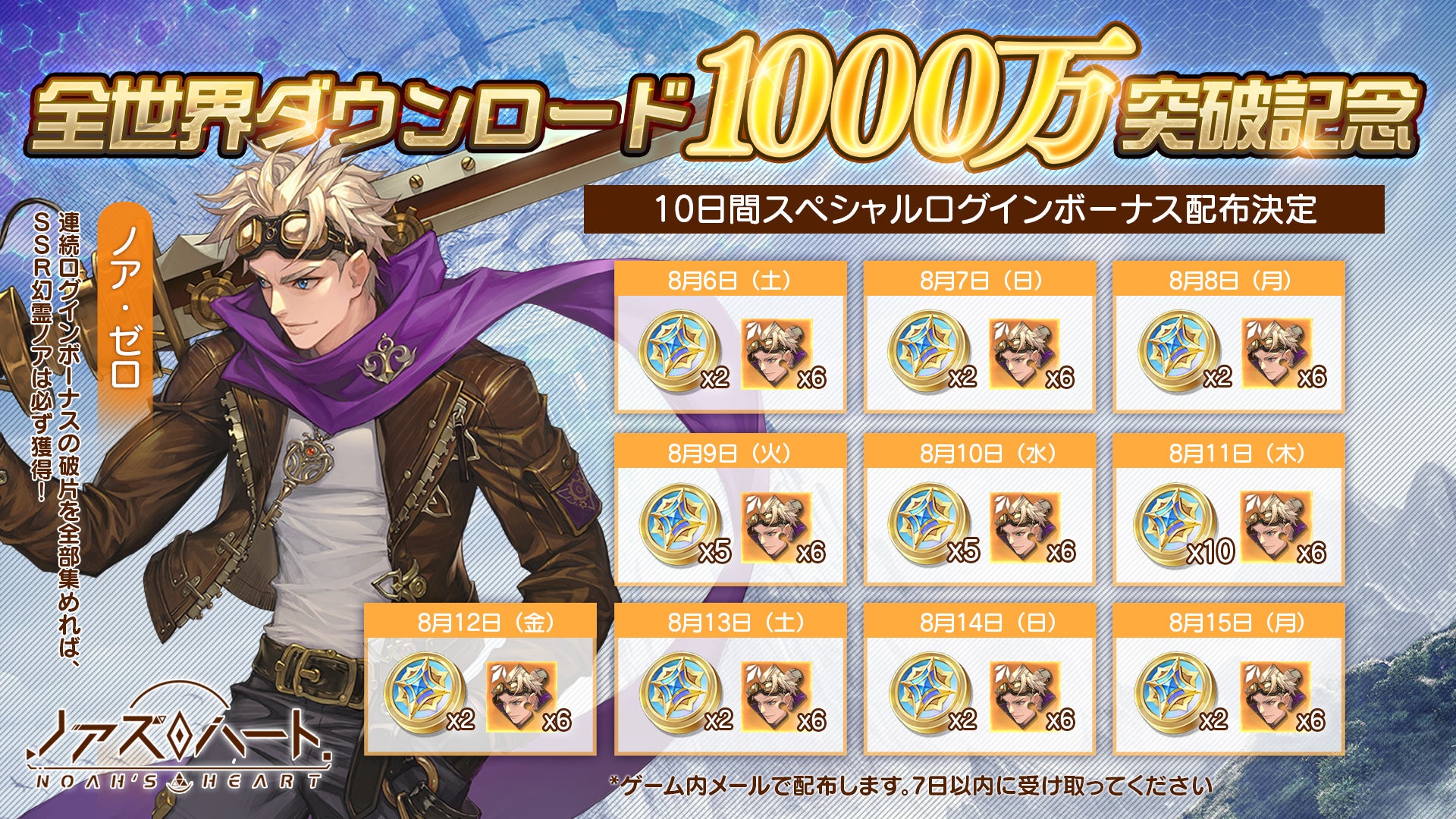 全世界ダウンロード1000万突破に感謝を込めて、「SSR幻霊ノア×60」と「ラッキーコイン×32」をプレイヤーの皆様へお送りいたします。