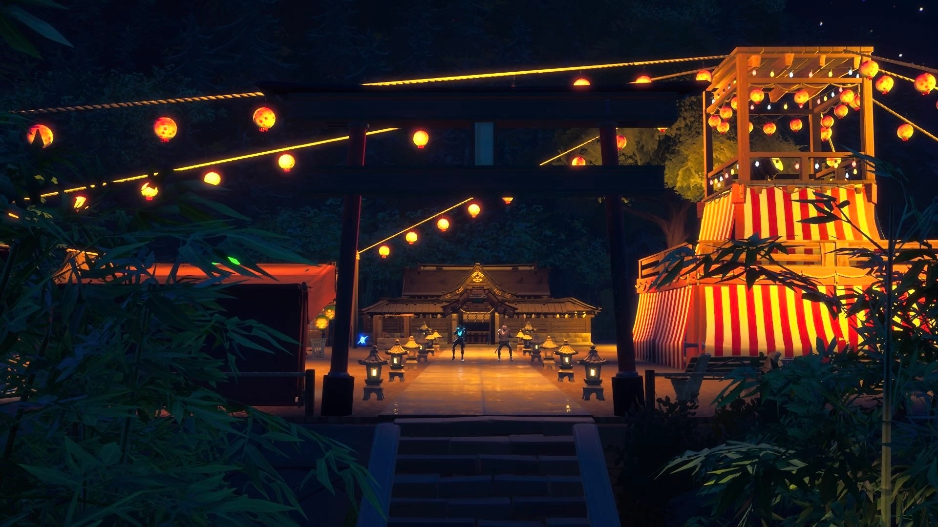 山の中にある神社にやぐらが組まれており、周辺には屋台が並びます。神社を降りると住宅街が広がり、更に進むと海が見えてきます。海では花火が上がる演出もあり、日本の縁日を存分に楽しめるオリジナルのメタバース空間となっています。公開は8月下旬を予定。