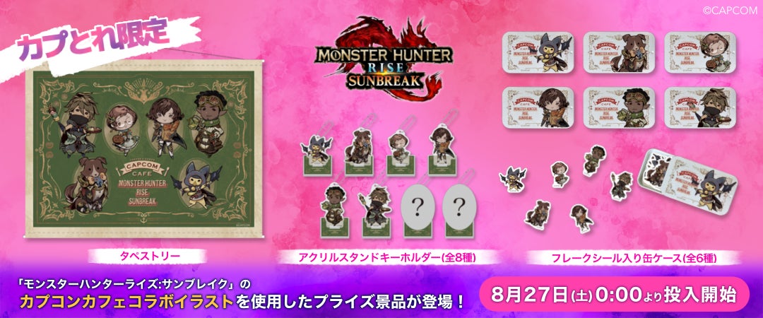 また、カプコンカフェで販売する「トレーディングアクリルスタンドキーホルダー」「トレーディングフレークシール入りタブレット缶ケース」につきましても、カプとれにてプライズ景品としても展開致しますので、是非この機会をお見逃しなく!