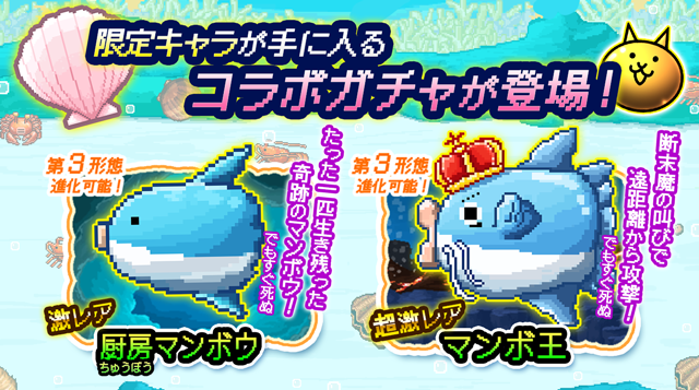 コラボ限定キャラクターが出現する「生きろ!マンボウ!」コラボガチャを開催いたします。