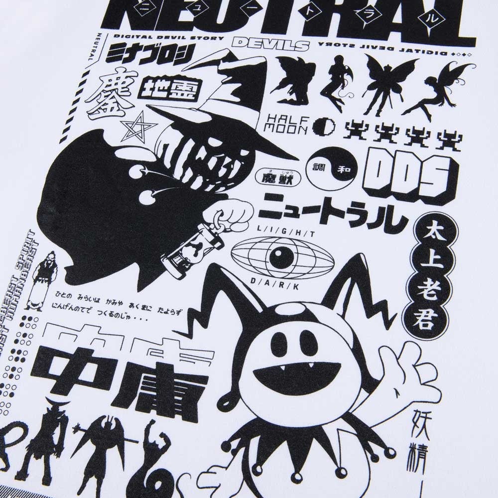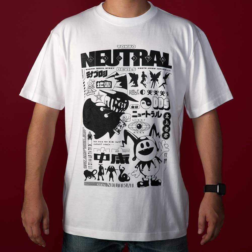第1弾で製作された「ロウ」&「カオス」Tシャツ2種に続き、第2弾は「ニュートラル」&「魔人」をモチーフとしたTシャツ2種を販売!「ニュートラルTシャツ」には、真・女神転生シリーズのアイコン的キャラを中心に、同属性の悪魔やキーワードを散りばめたデジタルなデザイン。