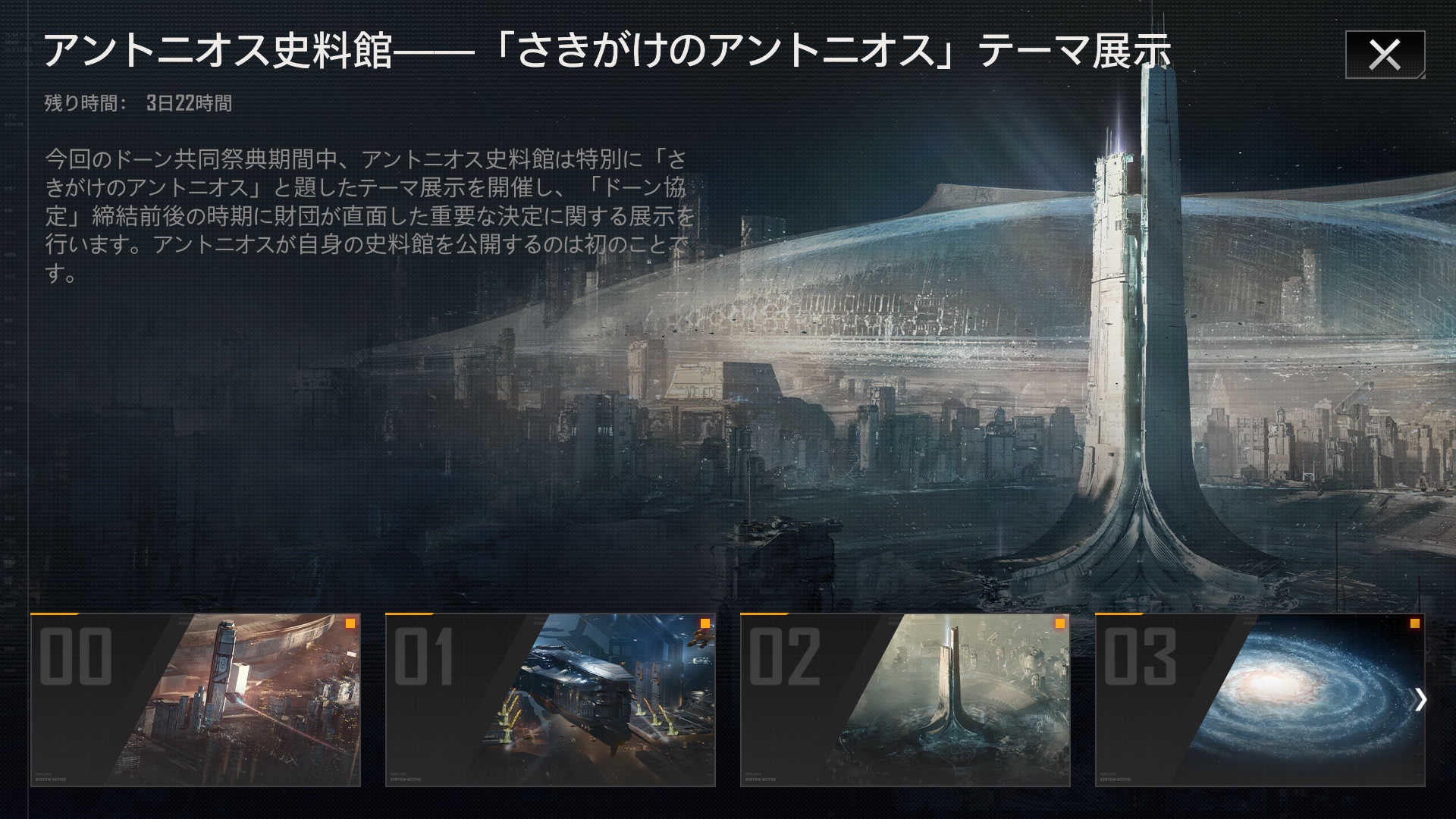 今回のドーン共同祭典のホストであるアントニオスは、アントニオス史料館にて「さきがけのアントニオス」と題した展示会を開催しています。アントニオスが自身の史料館を公開するのは初のことです。この史料館は数千年以上の歴史があり、館内の歴史資料もアントニオスによる星系開拓史が記録されています。