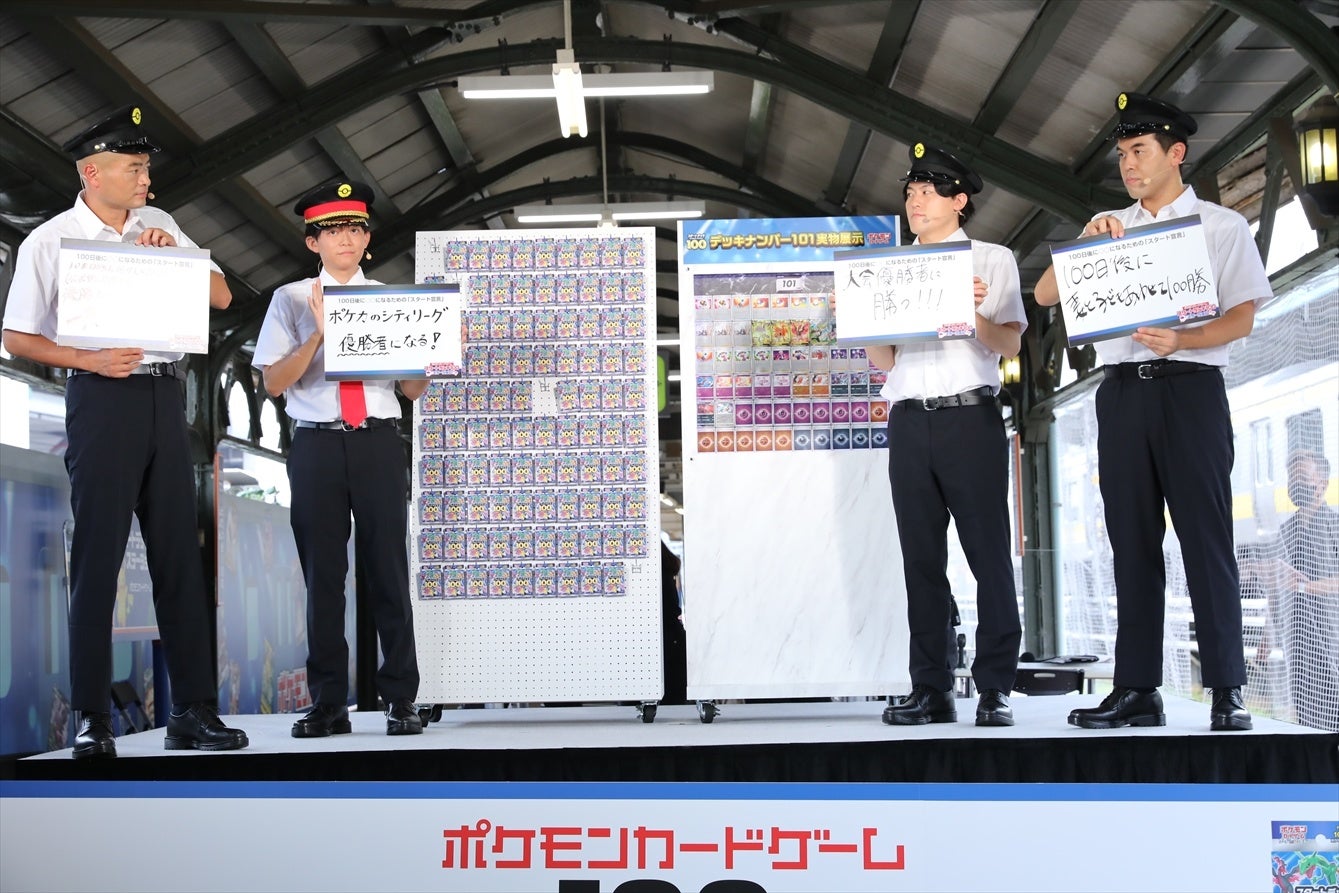 発表会では、イベント会場となるJR両国駅にちなみ、松丸さんが駅長、あばれる君さんと土佐兄弟が駅員の姿で登場。「スタートデッキ100ステーション」のオープンを記念して、テープカットのセレモニーを実施しました。人生初のテープカットという4人が興奮を隠せない中、駅長の松丸さんによる「出発進行!」の合図とともに、白手袋をしたゲスト全員がテープにハサミが入れられ、「スタートデッキ100ステーション」のオープンを華やかに彩りました。「どんな駅にしていきたいか?」と聞かれた松丸さんは、「ポケモンカードは2年前に始めたんですが、始めた時の気持ちも今の気持ちもずっと楽しいままなので、これからする人も今ポケモンカードをやっている人も盛り上がれる。そんな駅にしたいなと思います!」と、意気込みを語りました。