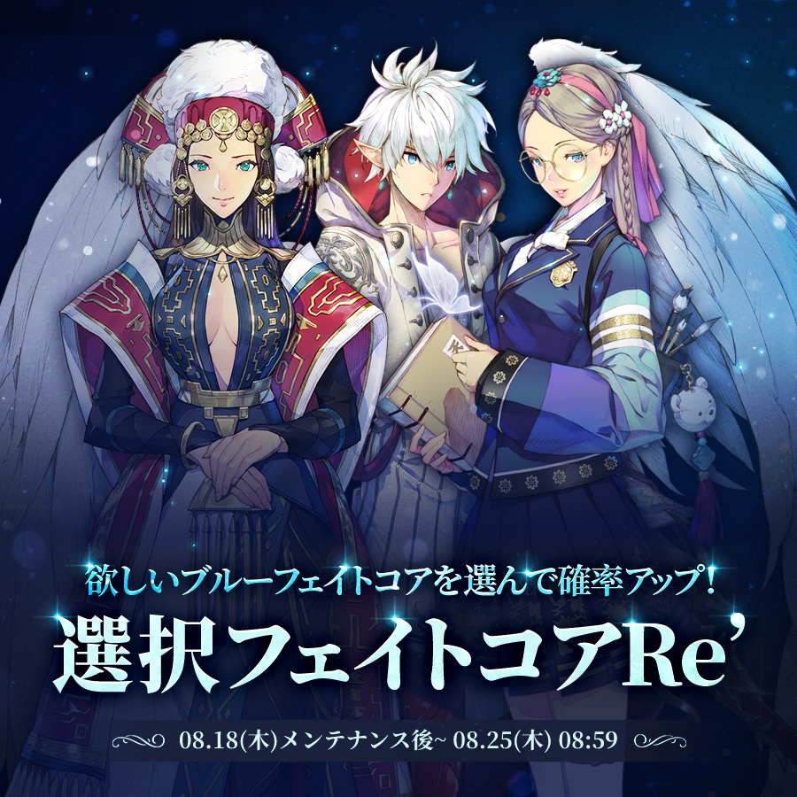 開催期間中は「予言を実行する者_グリシル」を始め「悲嘆の羽ばたき_ベンテン」、「ブルンの貴公女_ソア」など13体のブルーフェイトコアの内、選択した1体のフェイトコアが通常より高い確率で英雄本体とフェイトコアを一緒に獲得することができます。