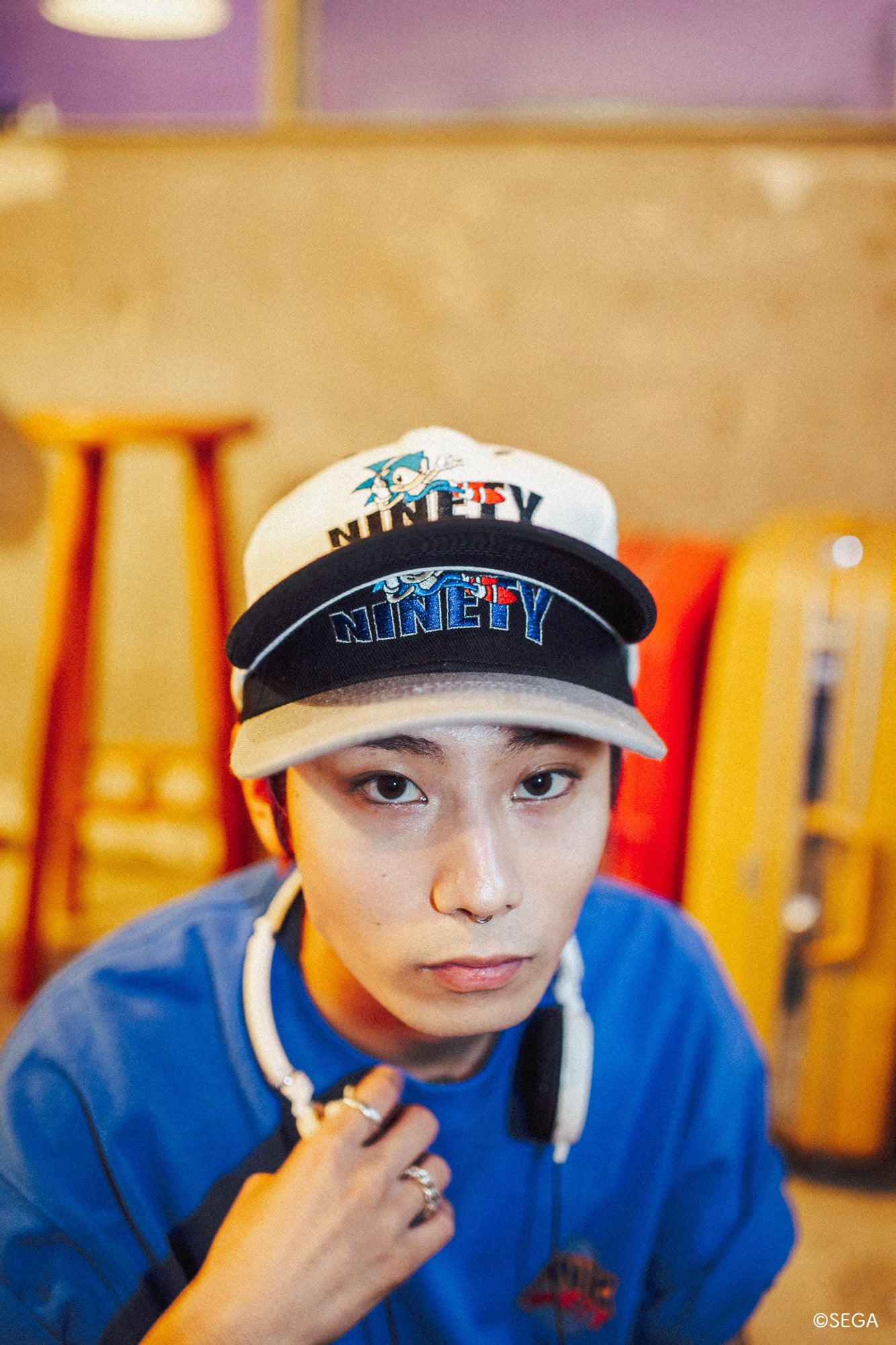 「NINETY」に寝そべるソニック・ザ・ヘッジホッグがアイコニックなキャップ。