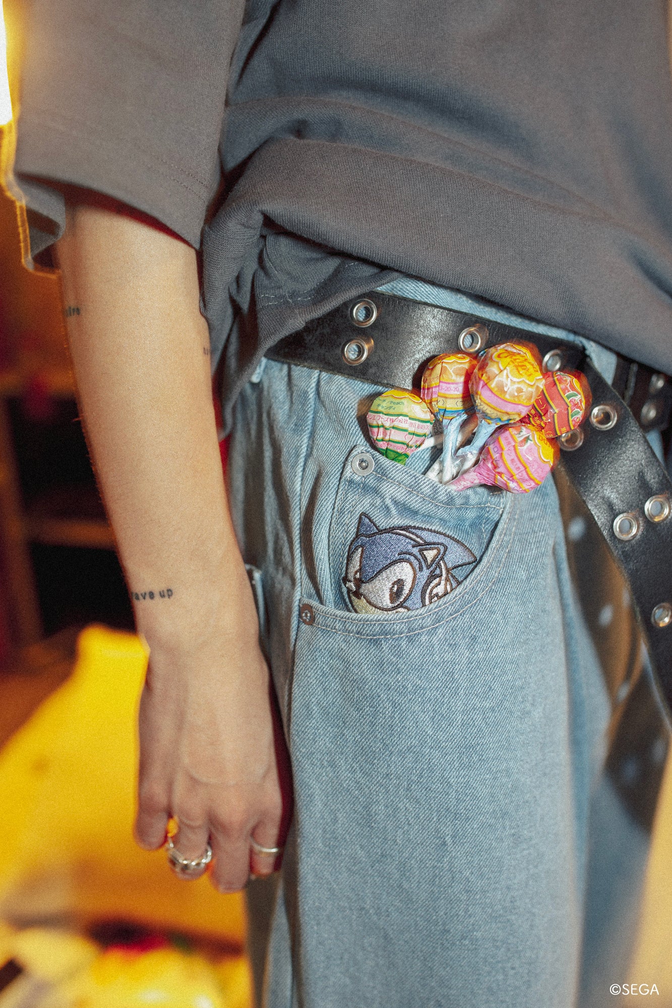 バックポケットのコラボ仕様のソニック・ザ・ヘッジホッグがインパクトのあるデニムパンツ。