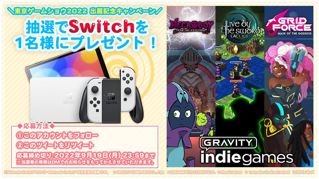 GRAVITY INDIE GAMES公式Twitter(https://twitter.com/gravity_indie )をフォロー&対象のツイートをリツイートで、Nintendo Switch™を1名様にプレゼントいたします。