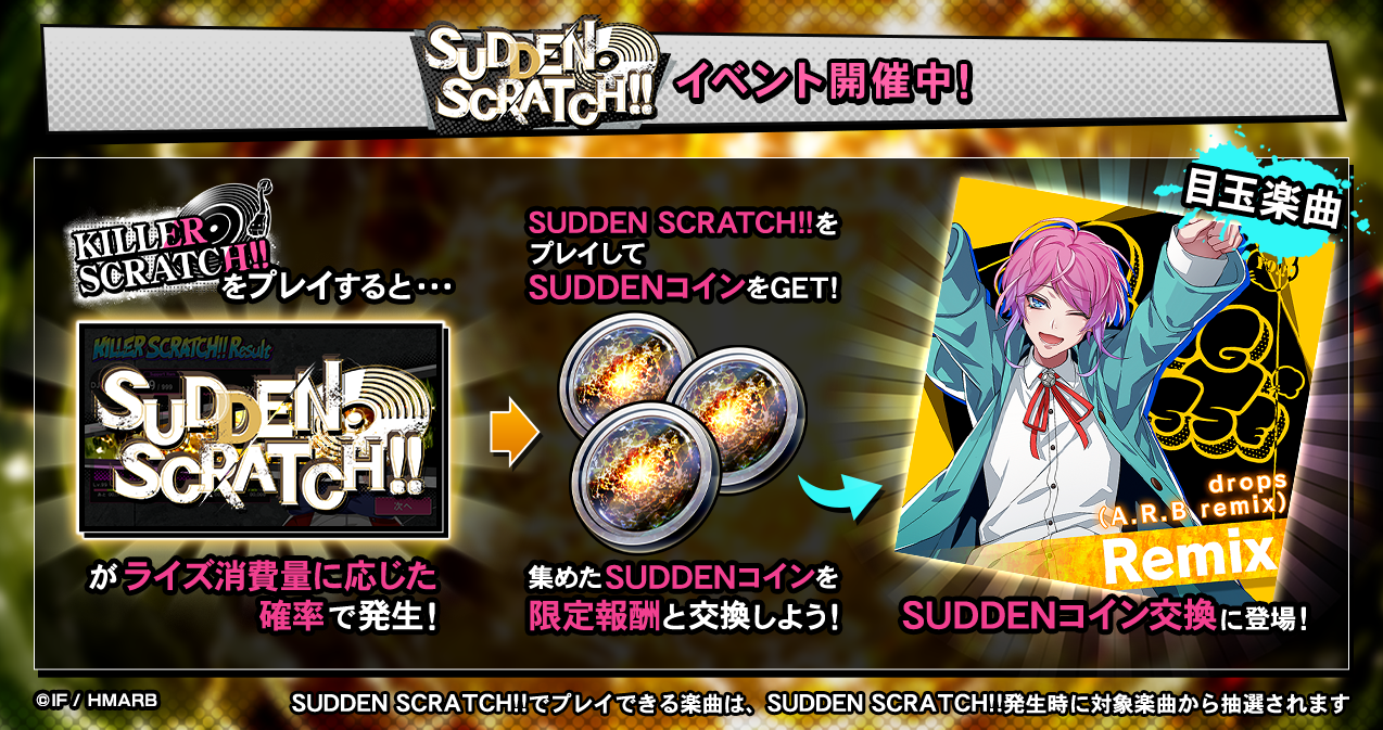 イベント期間中、KILLER SCRATCH!!をプレイするとライズ消費量に応じた確率でSUDDEN SCRATCH!!が発生します。SUDDEN SCRATCH!!をプレイすると、通常の報酬アイテムの他、限定アイテム「SUDDENコイン」を獲得することができます。「SUDDENコイン」を集めることで、新楽曲「drops(A.R.B remix)」と交換することが可能です。詳細はアプリ内お知らせをご確認ください。