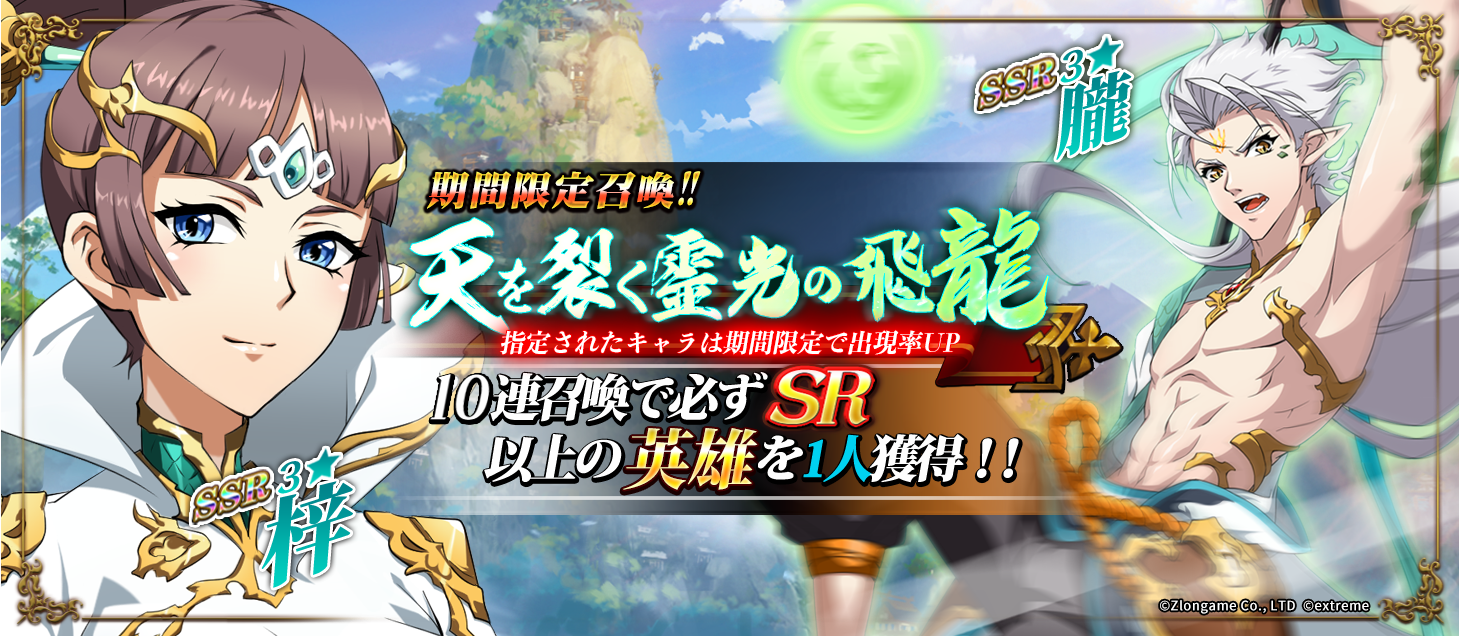 『天を裂く霊光の飛龍』は10連召喚で必ずSR以上の英雄を一人獲得できる、期間限定召喚です。SSR梓、SSR朧の出現確率が期間限定でアップします。