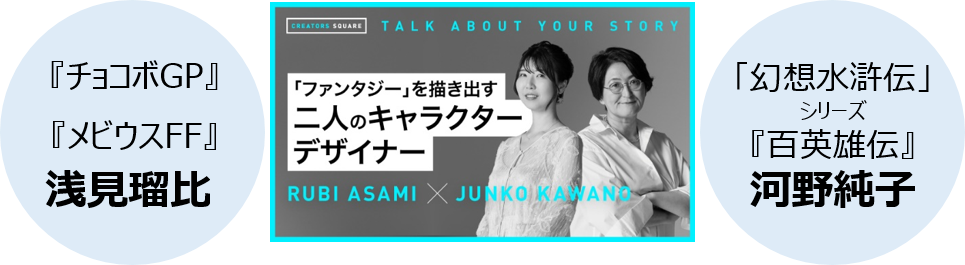 第3回目はスクウェア・エニックス デザイナーの浅見瑠比(あさみ るび)が、コナミデジタルエンタテインメント在籍時代に幻想水滸伝のキャラクターデザインを務めた河野純子(かわの じゅんこ)氏をゲストにお迎えします。今回は「描くこと」をテーマに、この番組でしか観られない貴重な話を語り合うほか、キャラクターデザイナー2人の対談にあたり、「ファイナルファンタジー」×「幻想水滸伝」のコラボイラストが実現。コラボイラストは動画内で公開後、壁紙としても配信することが決定しました。