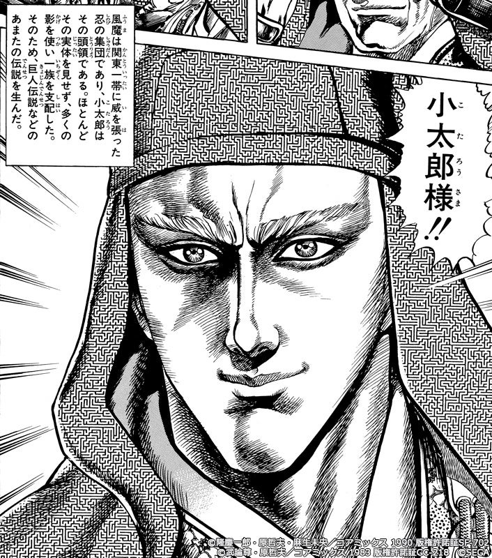関東一帯に威を張った忍の集団である風魔の頭領。多くの影を使い一族を支配し、あまたの逸話を生んだ伝説の忍。秀吉の側室である茶々君が席を設けた能舞台で、慶次と傾奇者同士の果たし合いに臨み、戦国の徒花として咲き乱れる。