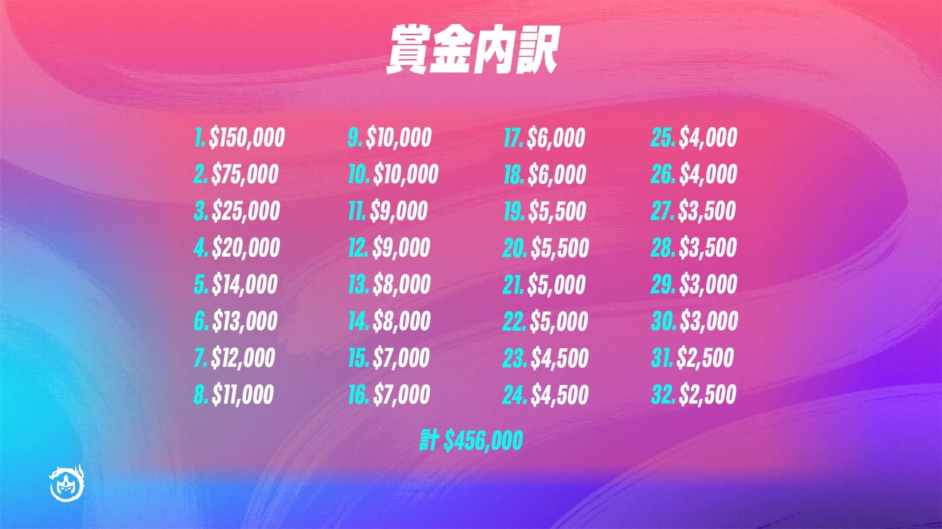 出場プレイヤーは大会期間中、常に上位を目指して戦うことになりますが、ここでは特に最終的な順位と賞金についてお伝えしておきたいと思います。今大会では、1位と2位の賞金を大幅に増加させて、最終日の試合の重要性を大幅に増加させることにしました。賞金総額および各順位の賞金は以下のとおりです。