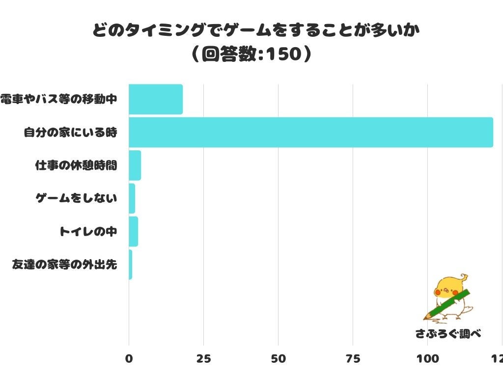 どのタイミングでゲームをすることが多いをアンケートにて調査したところ、1位は「自分の家にいる時」でした。