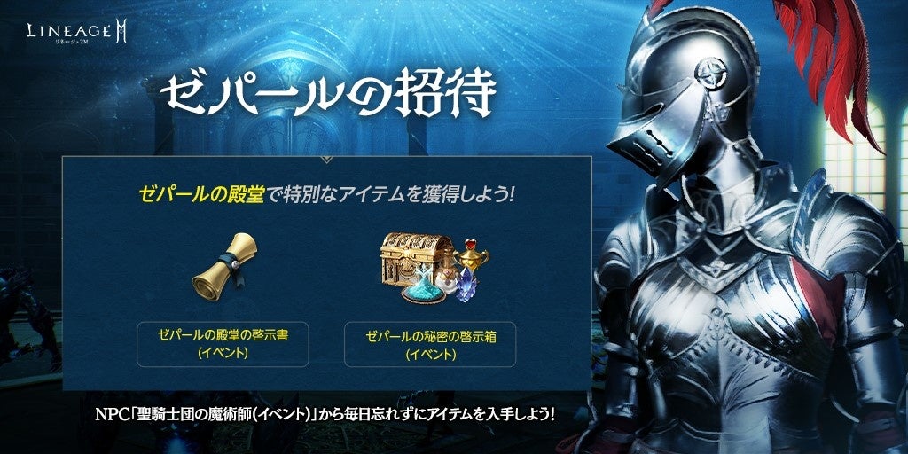 期間中、アリーナ ダンジョン「ゼパールの殿堂」のロビーに、イベントNPC「聖騎士団の魔術師(イベント)」が出現します。