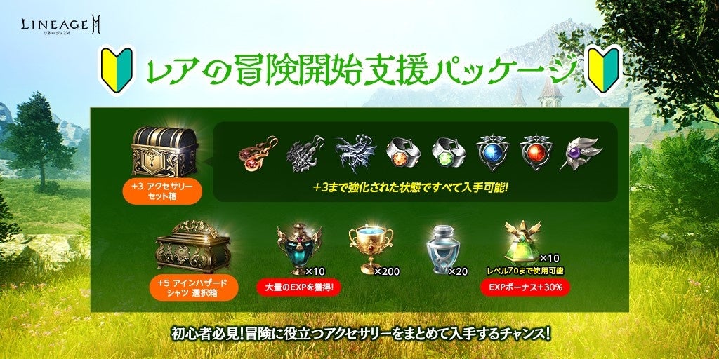 「+3アクセサリー セット箱(刻印)」1個、「+5アインハザード シャツ選択箱(刻印)」1個、「信念の快速成長のウィンド ポーション(レベル70)」10個などがセットになった「レアの冒険開始支援パッケージ」が登場しました。