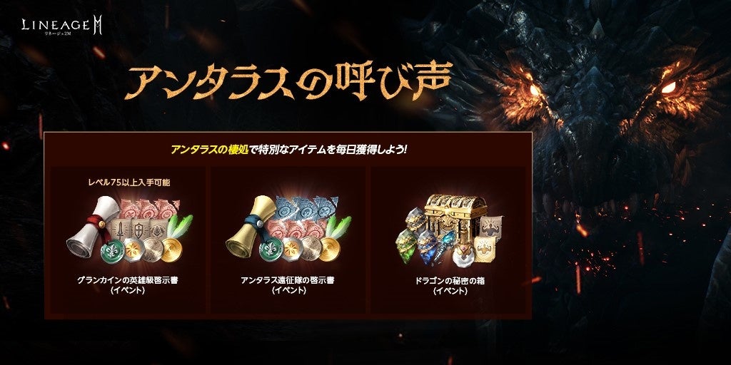 期間中、マスター ダンジョン「アンタラスの棲処」のロビーに出現するイベントNPC「エリカ(イベント)」から「アンタラス遠征隊の啓示書(イベント)」「ドラゴンの秘密の箱(イベント)」をアデナで獲得することができます。さらにレベル75以上のキャラクターの場合は「グランカインの英雄級啓示書(イベント)」をアデナで獲得することが可能です。