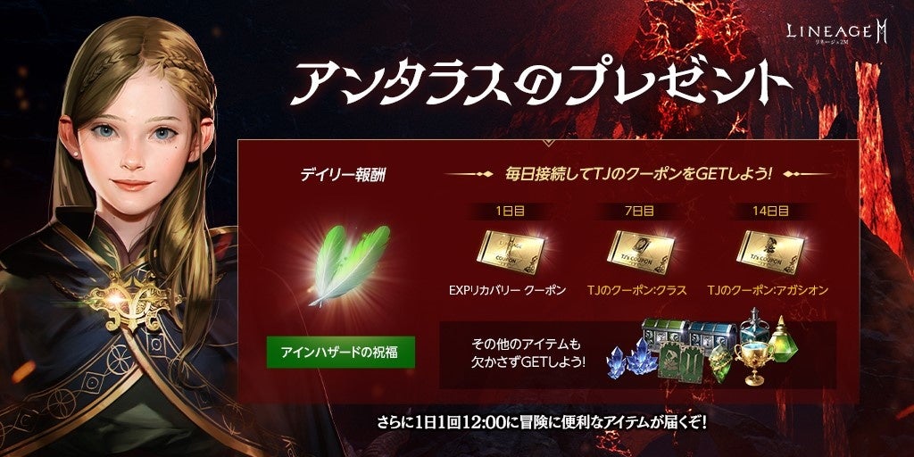 デイリー報酬として、「アインハザードの祝福」1,000のほか、「TJのクーポン:クラス」「TJのクーポン:アガシオン」「EXPリカバリー クーポン」などを獲得することが可能です。