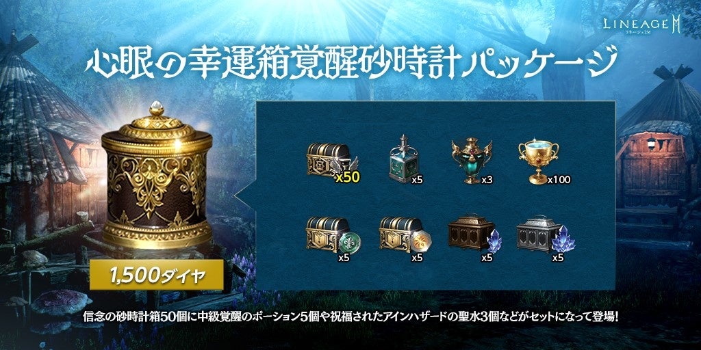 「信念の砂時計箱(刻印)」50個や、「光る名誉の勲章幸運箱(刻印)」5個、「光る啓示の証幸運箱(刻印)」5個、「祝福されたアインハザードの聖水(刻印)」3個、「中級覚醒のポーション(刻印)」5個などがセットになった「心眼の幸運箱覚醒砂時計パッケージ」が登場しました。