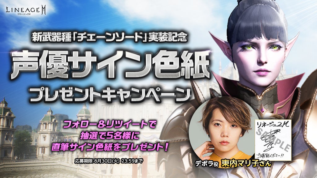 新武器種「チェーンソード」実装を記念して、デボラ役 東内マリ子さんの直筆サイン色紙を抽選でプレゼントします。