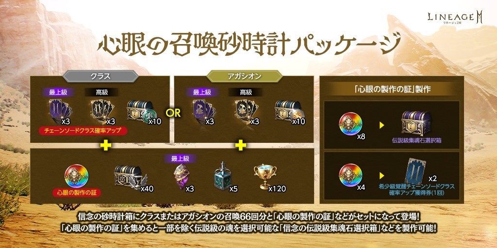 「信念の砂時計箱(刻印)」40個に、チェーンソードクラス確率アップまたはアガシオンの召喚66回分、「心眼の製作の証(刻印)」1個、「光る名誉の勲章幸運箱(刻印)」10個または「光る啓示の証幸運箱(刻印)」10個などがセットになった「心眼の召喚砂時計パッケージ」が登場しました。