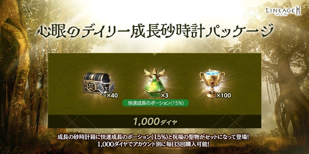 「信念の砂時計箱(刻印)」40個と、「快速成長のポーション(15%)」3個、「祝福の聖物」100個がセットになった「心眼のデイリー成長砂時計パッケージ」が登場しました。
