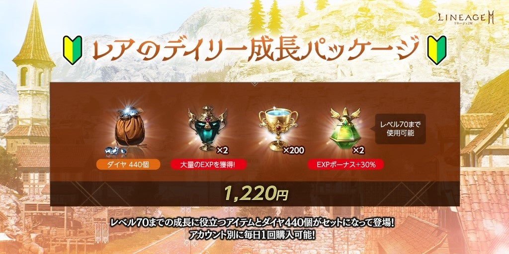 ダイヤ440個と、「祝福されたアインハザードの聖水(刻印)」2個、「祝福の聖物」200個がセットになった「レアのデイリー成長パッケージ」が登場しました。