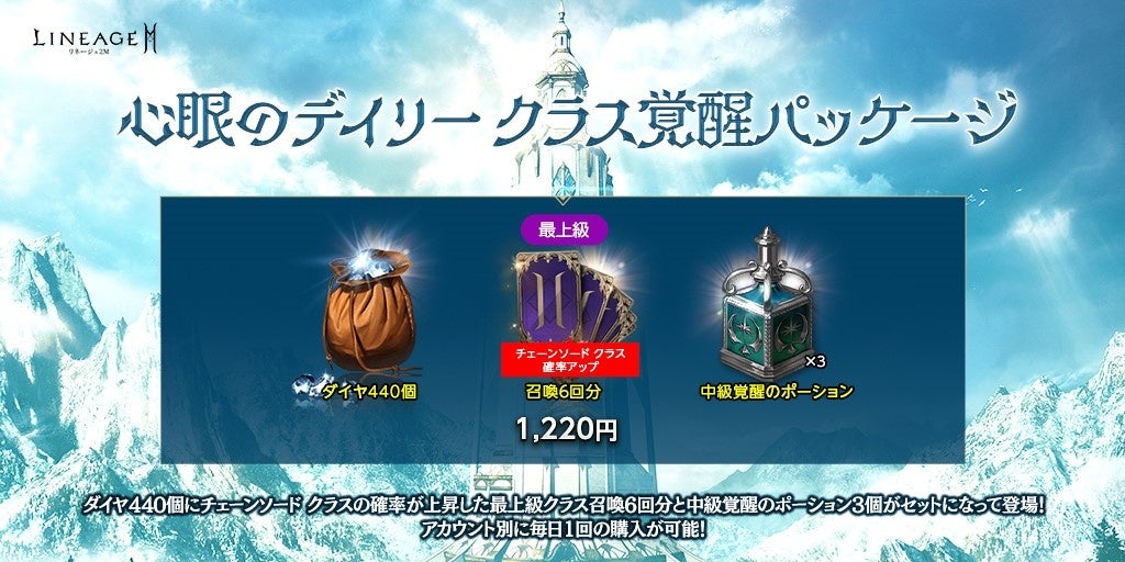 ダイヤ440個と、「信念の最上級チェーンソード クラス確率アップ獲得券(6回)(刻印)」1個、「中級覚醒のポーション(刻印)」3個がセットになった「心眼のデイリー クラス覚醒パッケージ」が登場しました。