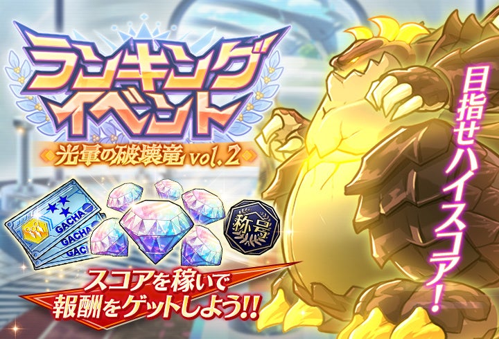ランキングイベント「光暈の破壊竜 vol.2」開催!制限時間内にボスに与えたダメージに応じてスコアが決定し、スコアに応じて様々な報酬を獲得して他のプレイヤーと競い合いましょう!今回のボスは「光」属性となりますので、「闇」属性のパーティで挑んでみてください。