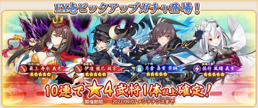 期間限定で利用できるピックアップガチャからは、戦国†恋姫EX壱 ~奥州の独眼竜編~で登場したキャラの排出確率がアップ!ぜひこの機会に手に入れましょう!