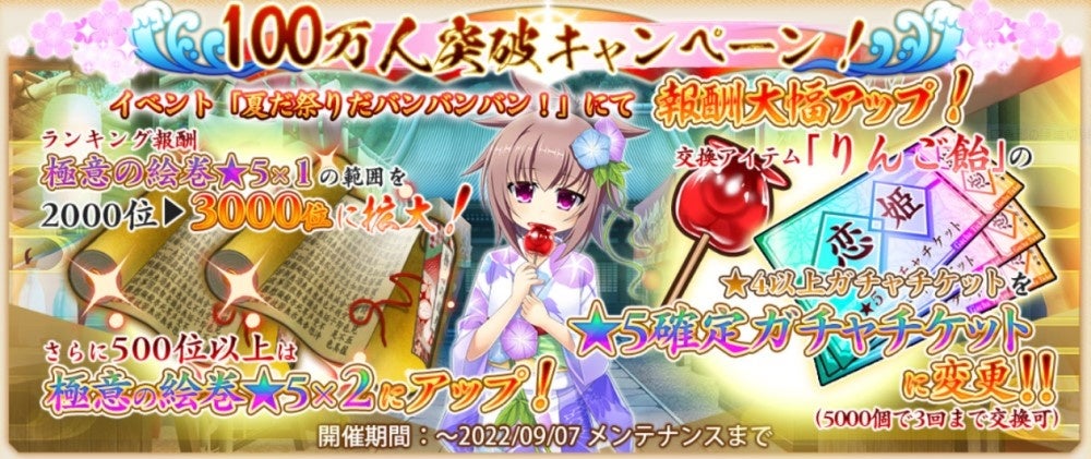 登録者数100万人突破を記念して、現在開催中のイベント「夏だ祭りだバンバンバン」で手に入るランキング報酬、よろず屋交換報酬が増量!お見逃しなく!