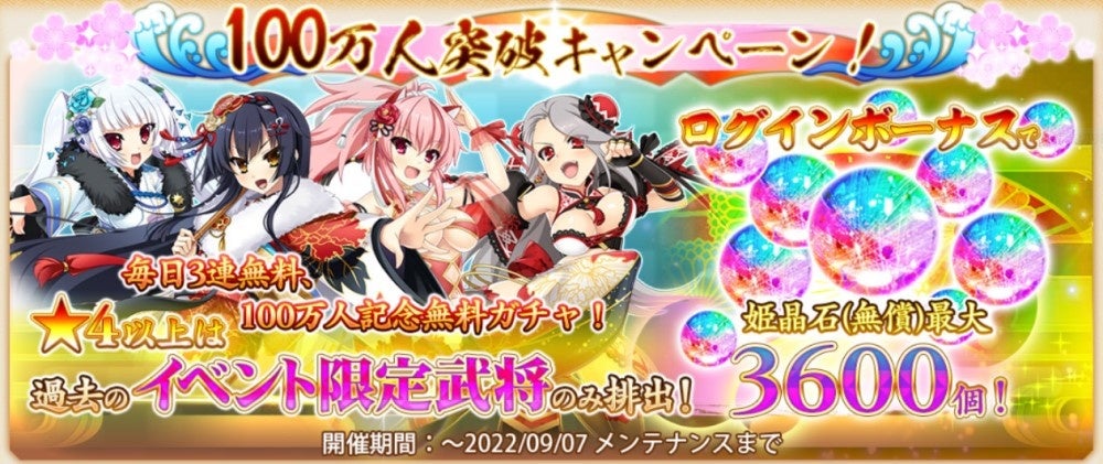 『戦国†恋姫オンライン ~奥宴新史~』は、皆様からの応援により登録者数が100万人を突破いたしました!つきましては、感謝の気持ちを込めまして期間限定でキャンペーンを実施いたします。
