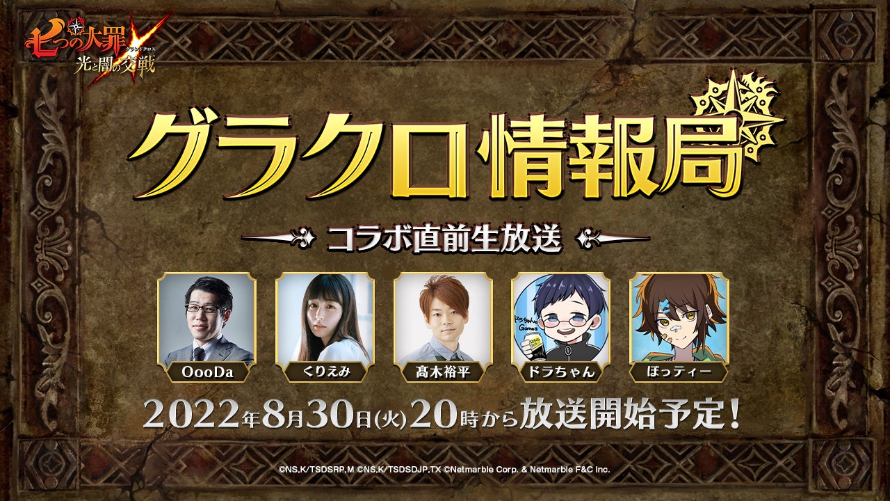 今回は、MCにOooDaさん、アシスタントにくりえみさん、ゲストにゴウセル役の髙木裕平さん、『グラクロ』実況動画で人気のドラちゃんさんとぼっティーさんが出演いたします。気になる最新情報を交えながらグラクロの魅力をご紹介いたしますので、どうぞお見逃しなく!