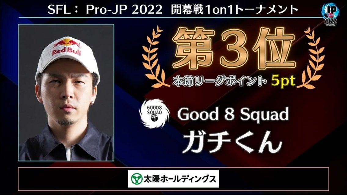 さらに、3位タイとなった「Good 8 Squad」どぐら選手と、同じく「Good 8 Squad」ガチくん選手には、太陽ホールディングス株式会社より、賞金10万円がそれぞれ贈られます。