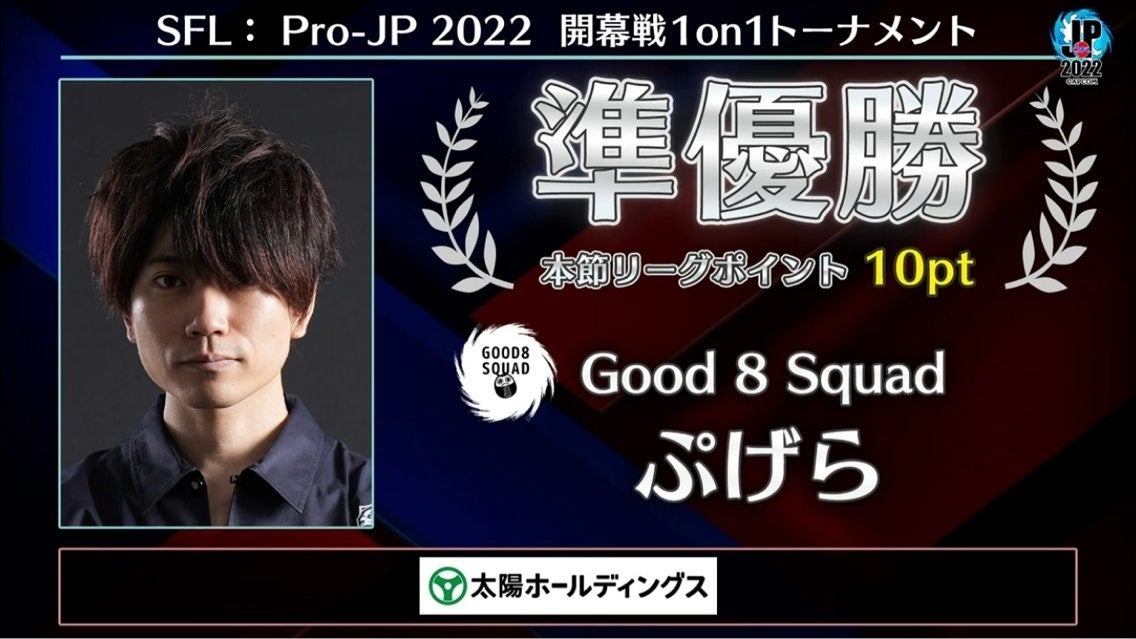 また、惜しくも準優勝となった「Good 8 Squad」ぷげら選手には、太陽ホールディングス株式会社より、賞金30万円が贈られます。