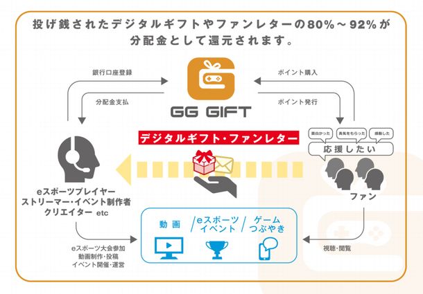 GGGiftでは、eスポーツプレイヤーやストリーマー並びに関連するクリエイターを支援できるWEBデジタルギフトサービスです。GGGiftでファンレターやギフトを送ったり、ギフトBOXを開設することでファンレターやギフトを受け取ったりすることができます。受け取ったファンレターやギフトの一部が活動状況などに応じ、分配金としてプレイヤーに還元されます。