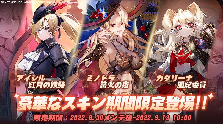 ほかにも、各種お得なパックが期間限定販売されていたり、豪華なスキン(アイシルのスキン「紅月の鉄騎」、ミノドラのスキン「篝火の夜」、カタリーナのスキン「風紀委員」)などが期間限定で登場したりと、いまだけの豪華なキャンペーンが目白押し! こちらもあわせてチェックしてくださいね。