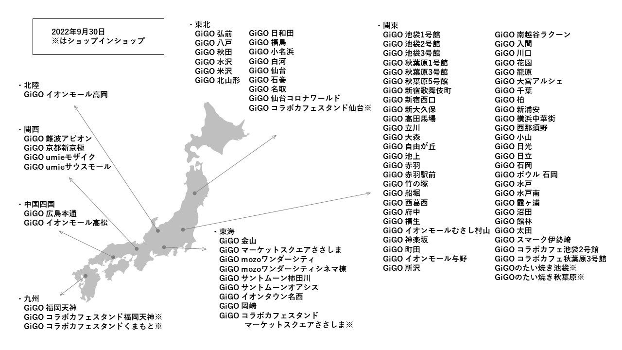 2022年3月9日に『GiGO 池袋1号館』からスタートした新生GiGOは、8月末日までに全国で51店舗まで拡大いたしました。9月には、青森県、秋田県、岩手県、山形県、福島県、栃木県、群馬県、茨城県で各県初の「GiGO」が誕生いたします。また、宮城県、埼玉県、東京都、愛知県においても9店舗が加わり、9月の1カ月間で32店舗の「GiGO」が誕生いたします。