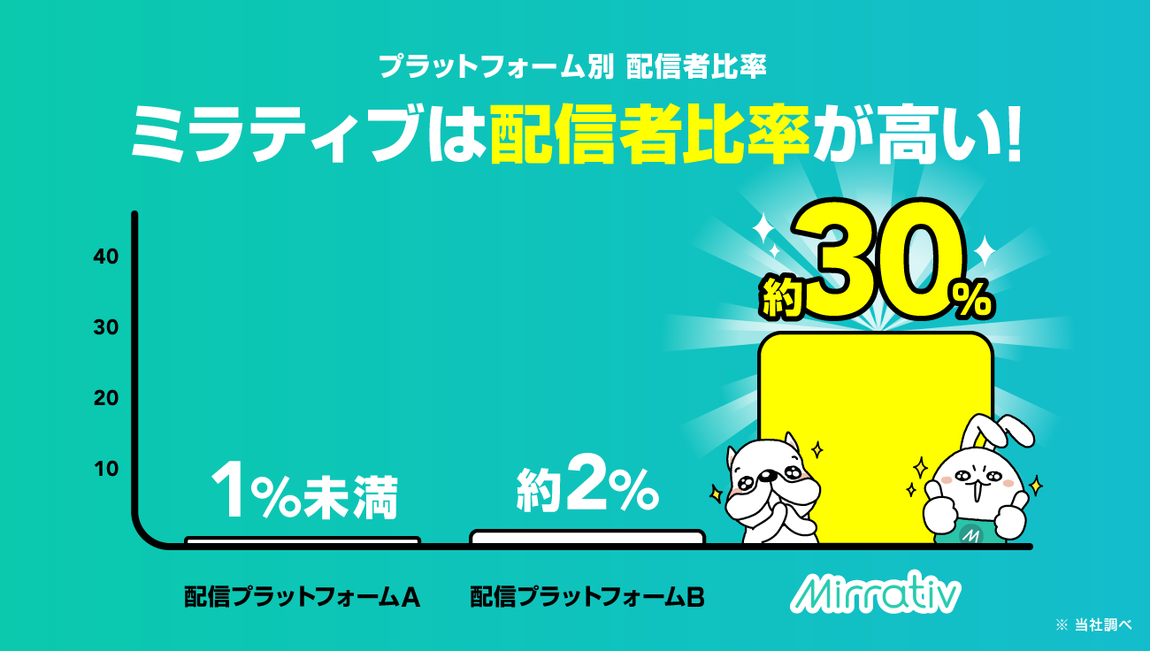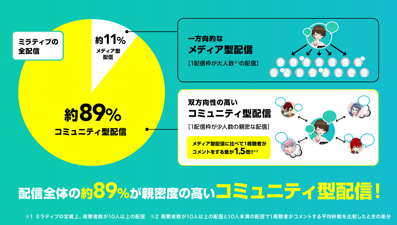 - ミラティブの配信者比率は約30%!1配信枠の参加者が少人数の親密な配信が89%を占めるプラットフォームに