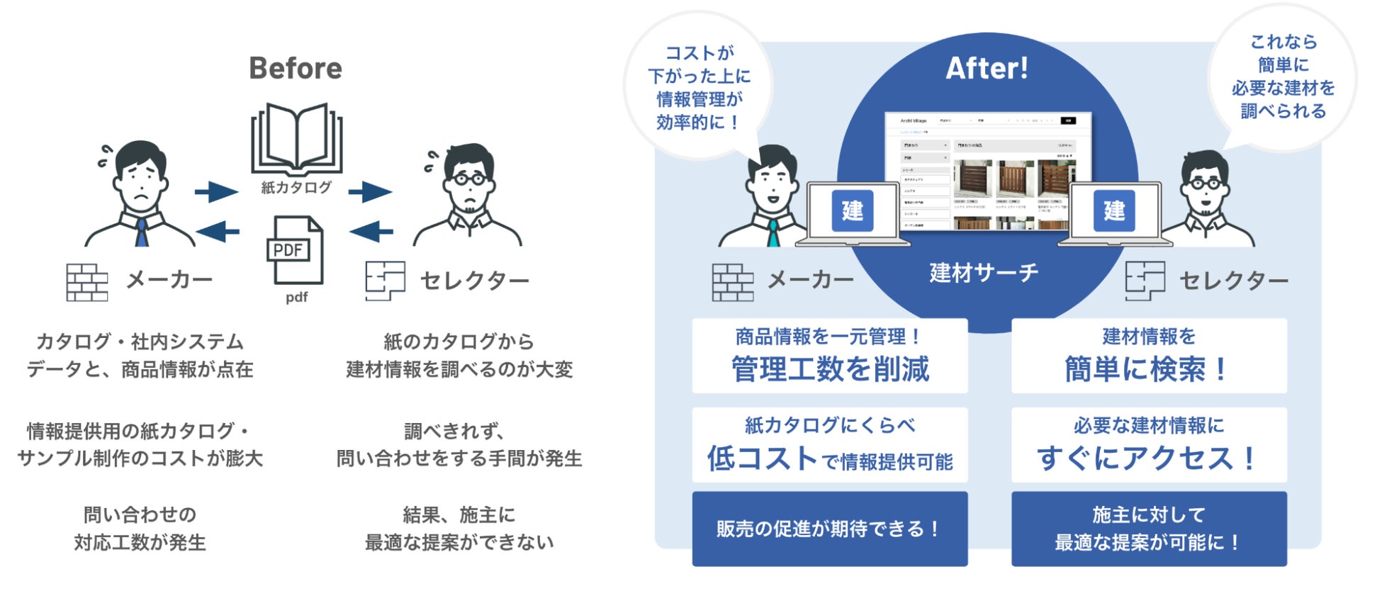 「建材サーチ」は、建材メーカーの建材商品の情報を1つに集約する総合プラットフォームです。ECサイトのような高い検索性により、目的にあった建材情報を早く的確に検索できることが特徴で、建材メーカー、セレクター双方の課題を解決可能です。