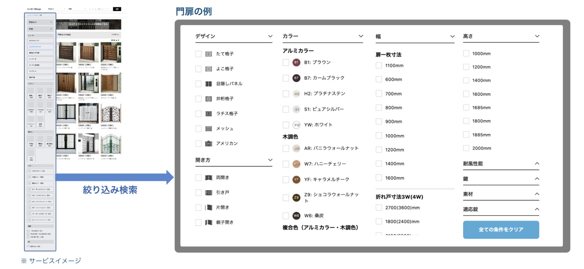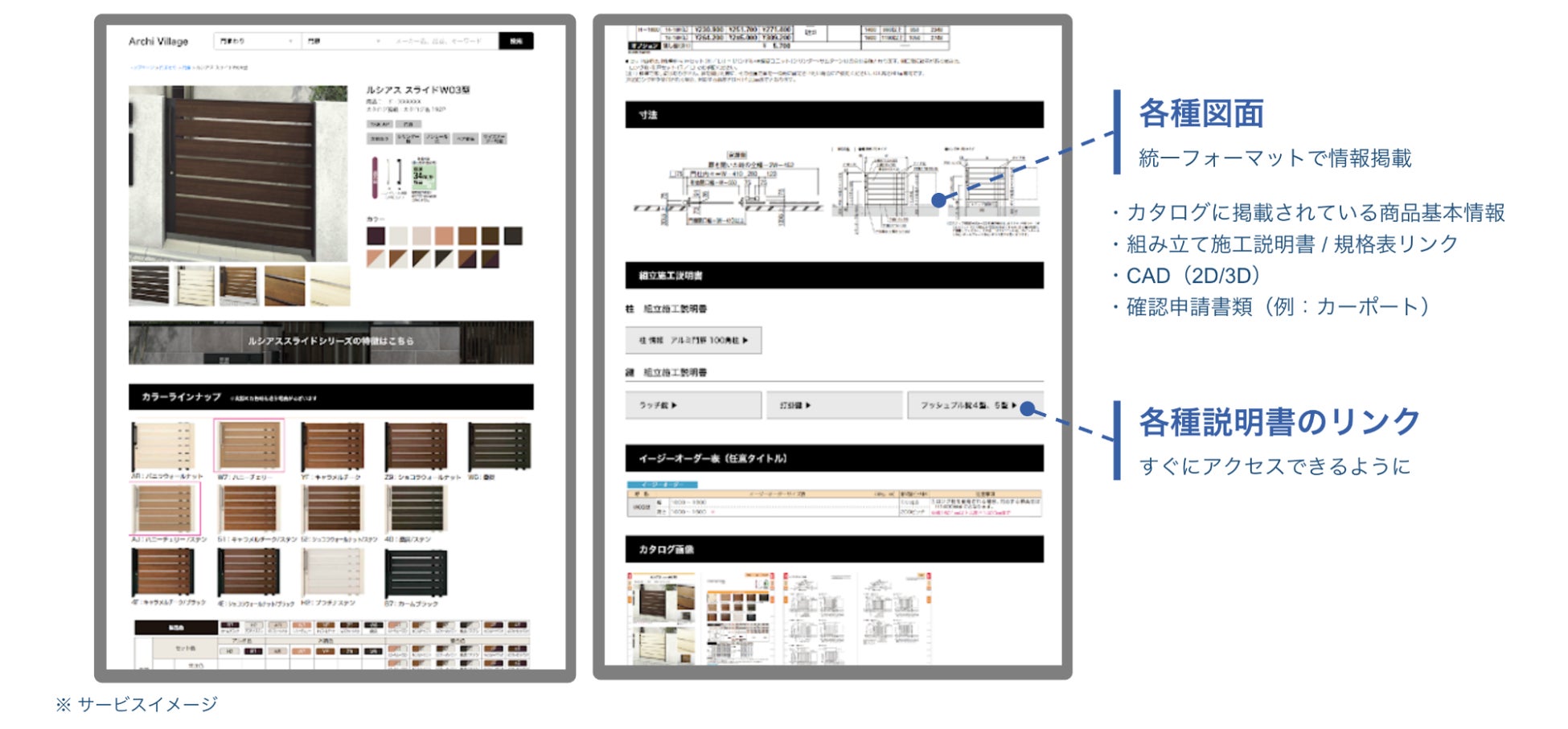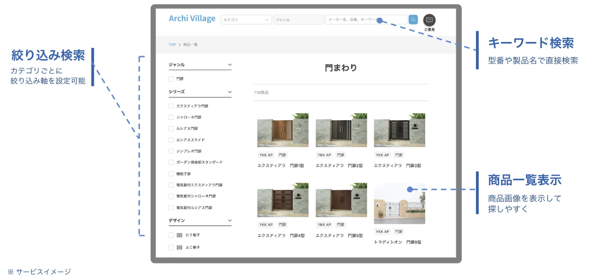 「建材サーチ」は建材商品情報の総合プラットフォームで、高い検索性により建材商品を探す手間を削減できるサービスです。今までにYKK AP株式会社、三協立山株式会社 三協アルミ社、四国化成工業株式会社が参画しており、さまざまなメーカーが参画することで、検索性のさらなる向上を目指しております。