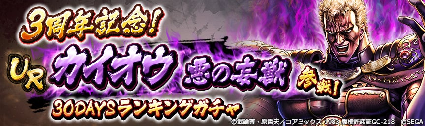 “3周年記念!30DAYSランキングガチャ”に、ついに兜を脱いだ「カイオウ 悪の妄獣」が、サービス3周年記念の新拳士として登場!ぜひ、この機会にUR「カイオウ 悪の妄獣」を迎え入れましょう。
