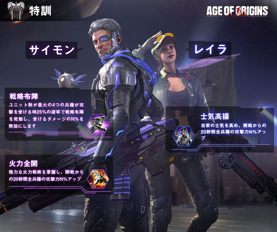 『Age of Origins』は、ゾンビを殲滅し、同盟を結成し、終末のような世界で軍隊を支配して、都市を管理し、人間文明の再構築を目的とした戦略シミュレーションゲームです。そんな『エイジオブゼット』で、味方全兵種の攻撃力を上げることができる強力なスキル「火力全開」、「士気高揚」を持つ「特訓」タイプの副官「サイモン」と「レイラ」が登場します。