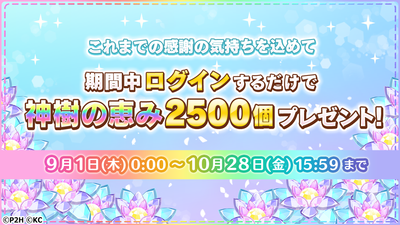 これまでの感謝の気持ちを込めて、期間中にログインすると神樹の恵み2500個をプレゼント! 最後まで『ゆゆゆい』をお楽しみください!