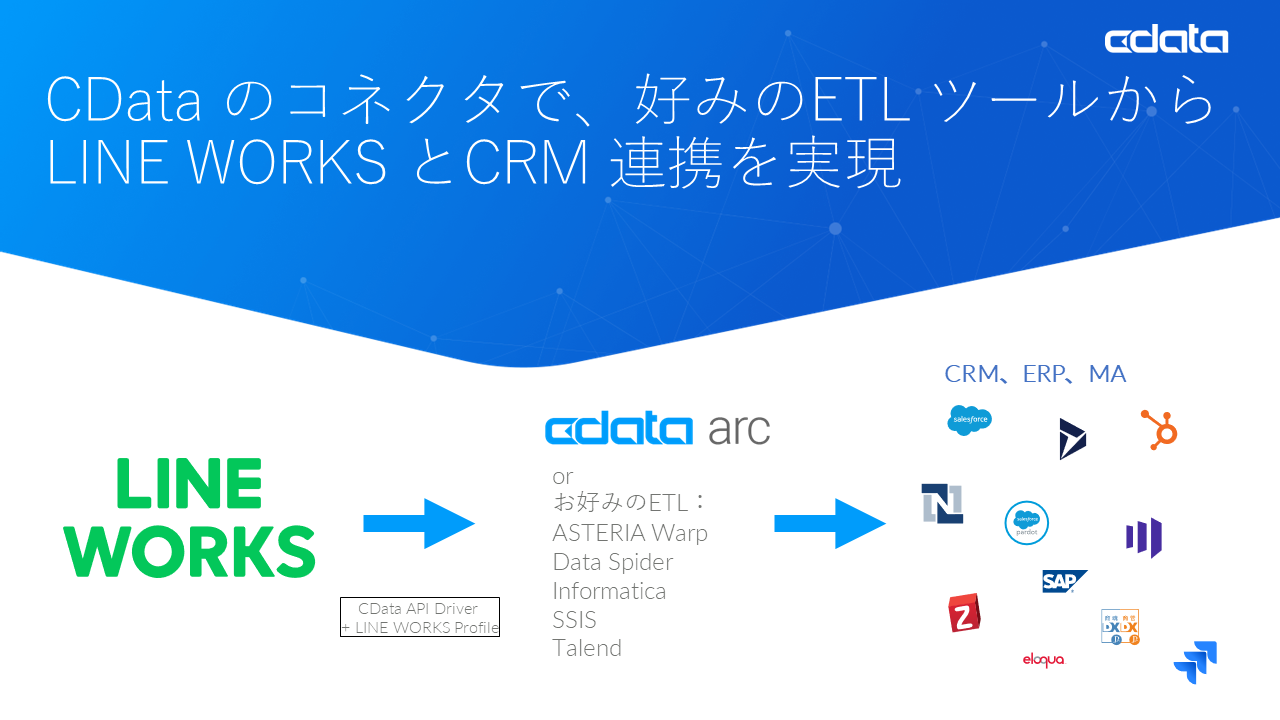 CDataの汎用ドライバーシリーズ『CData API Driver』が「LINE WORKS」に対応したことにより、CData API Driverを使うことで、CData Arc、ASTERIA Warp、DataSpider、InformaticaといったETLツールから「LINE WORKS」上のデータに接続が可能になり、Salesforce、Dynamics 365などとの連携を簡単に実現できるようになります。