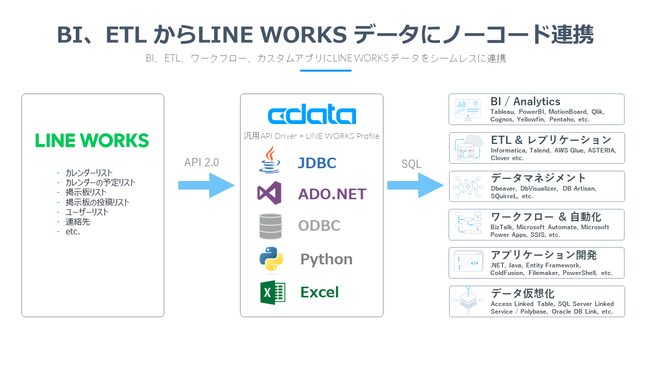 ■CData Drivers を使えばBIツール、ノーコードツールからも「LINE WORKS」に連携が可能