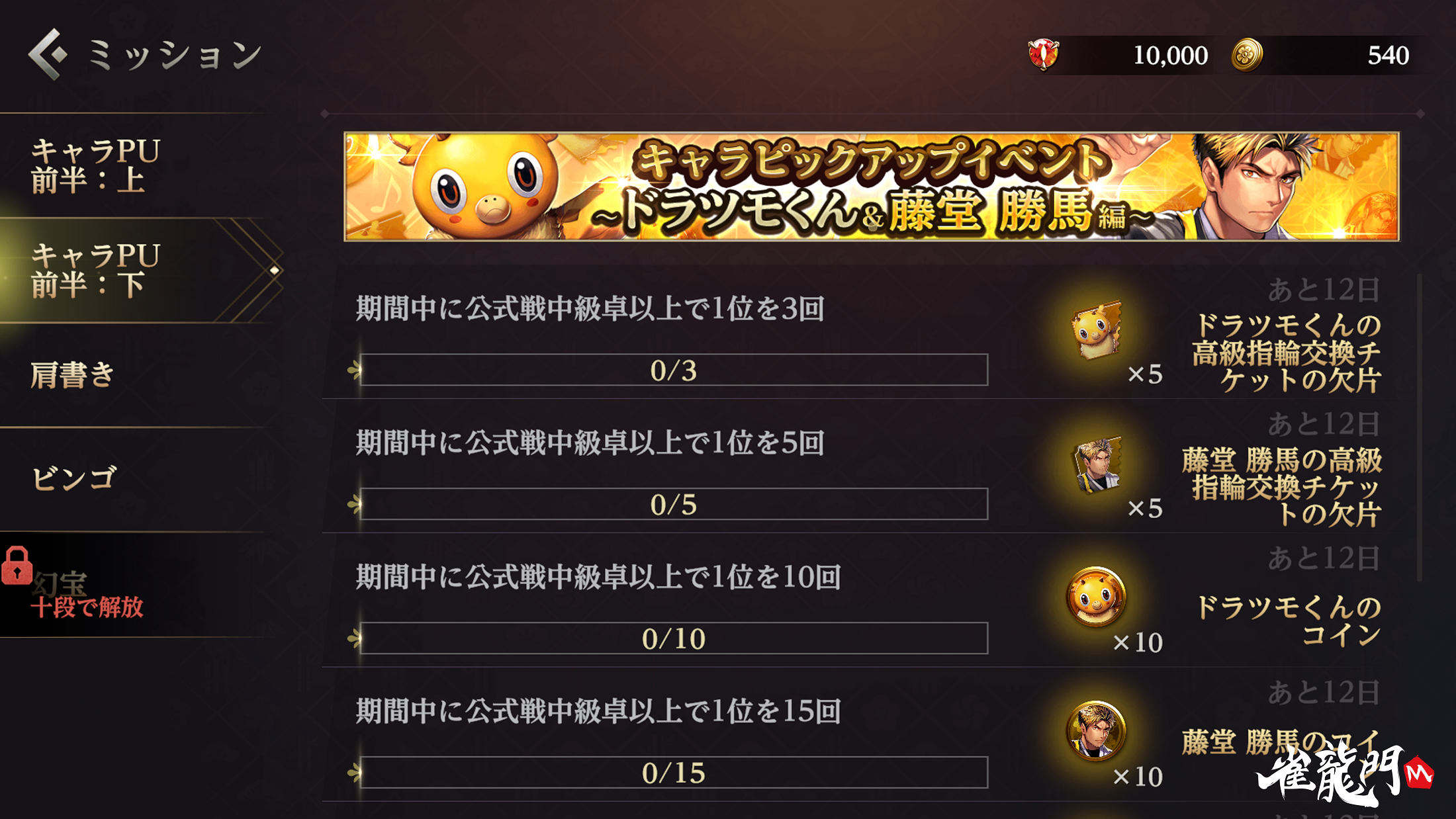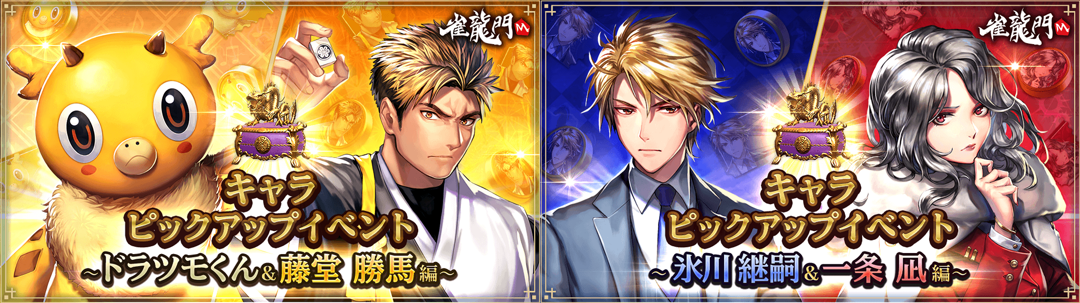 イベント限定商品となる「キャラピックアップ最高級箱」では、ピックアップ対象の「ドラツモくん」、「藤堂 勝馬」、「氷川 継嗣」、「一条 凪」のキャラの獲得率がUPします!