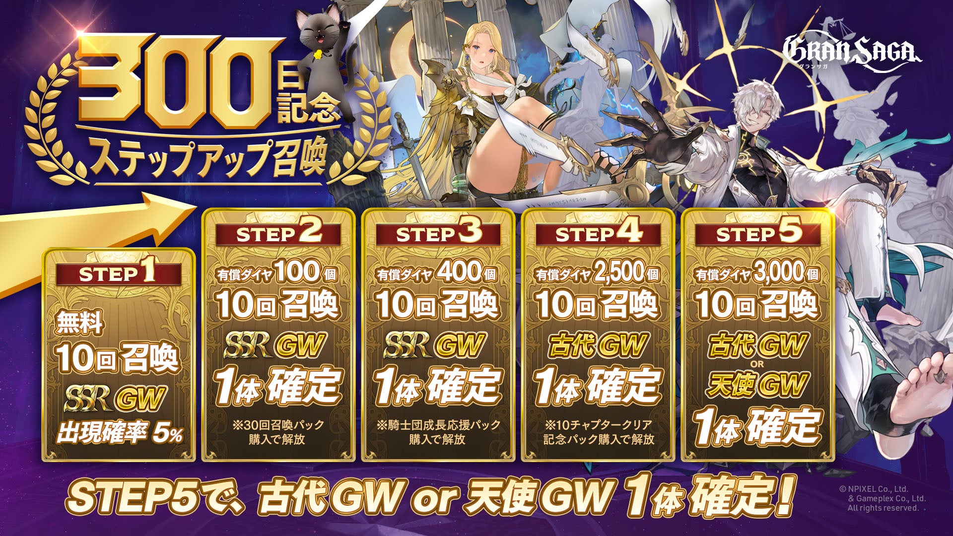 [召喚]に「300日記念 古代&天使GW 5段階のステップアップ召喚!」ページが追加されます。
